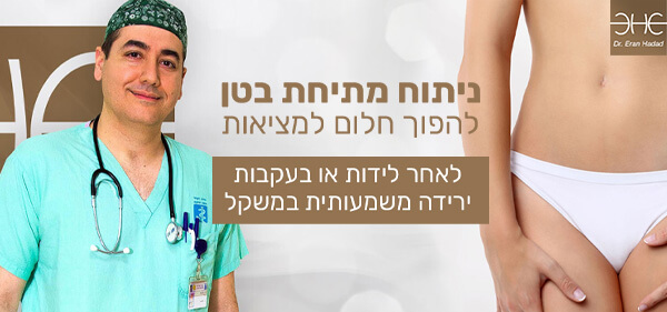 ניתוח מתיחת בטן הוא אחד הניתוחים הפופולאריים בקרב נשים ובאמצעותו ניתן להיפטר מעודפי העור והשומן בבטן. הניתוח מתבצע בדיוק ומקצועיות ע"י ד"ר ערן חדד תוך התאמה אישית לגוף ומבנה המטופלת ודגש על מינימום צלקות וטבור יפה וטבעי. השיטה הייחודית של ד"ר ערן חדד מביאה לשביעות רצון גבוהה בקרב המטופלות שלנו. במידת הצורך ובהתאם לרצון מטופלת ניתן לשלב בניתוח מתיחת בטן עיצוב של אזור המותניים ועיצוב של החלק התחתון של הגב. מלבד המקצועיות הבלתי מתפשרת, ד"ר ערן חדד והצוות שמים דגש על יחס וליווי אישי גם לאחר הניתוח!